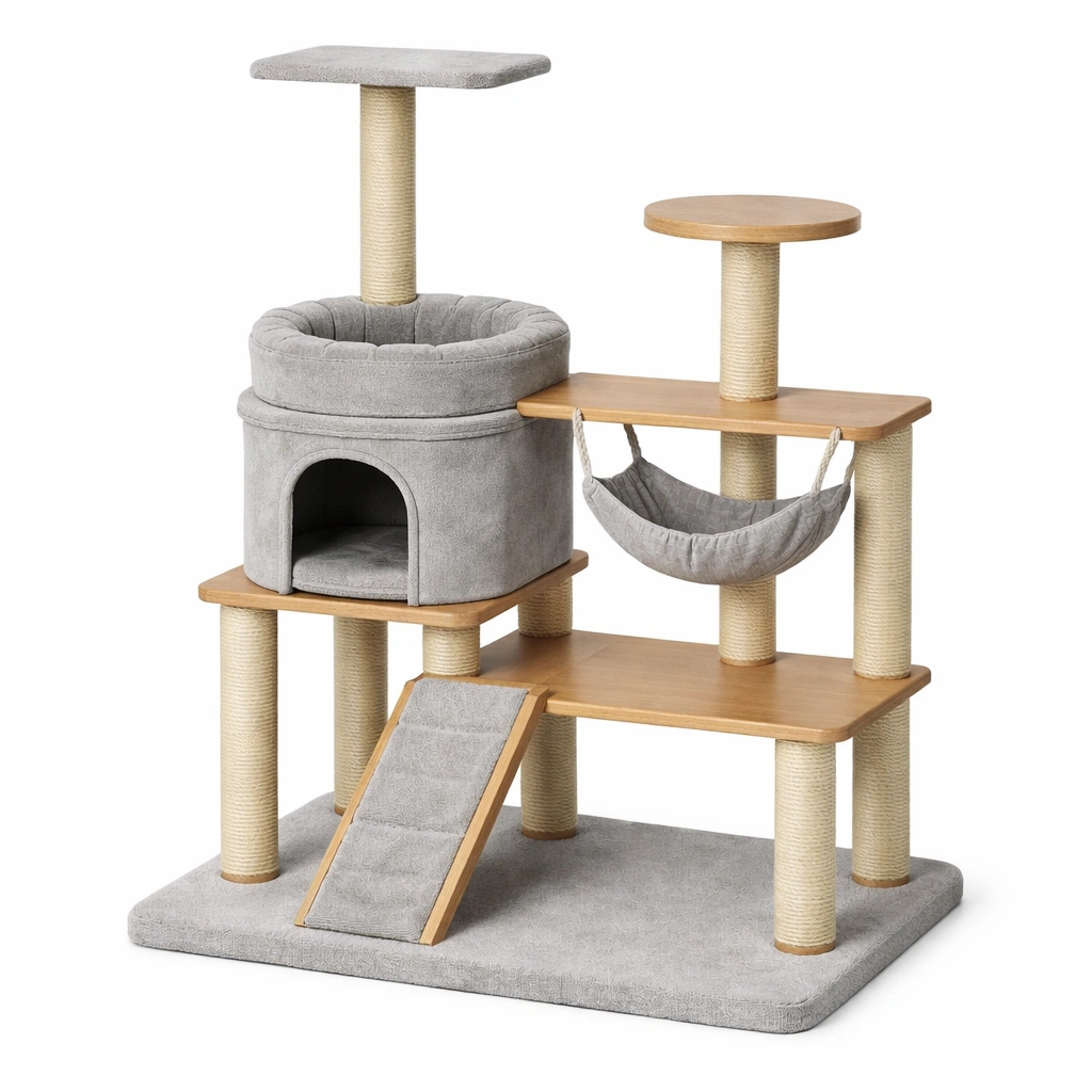 Árbol para gatos de madera y tela de poliéster gris con hamaca