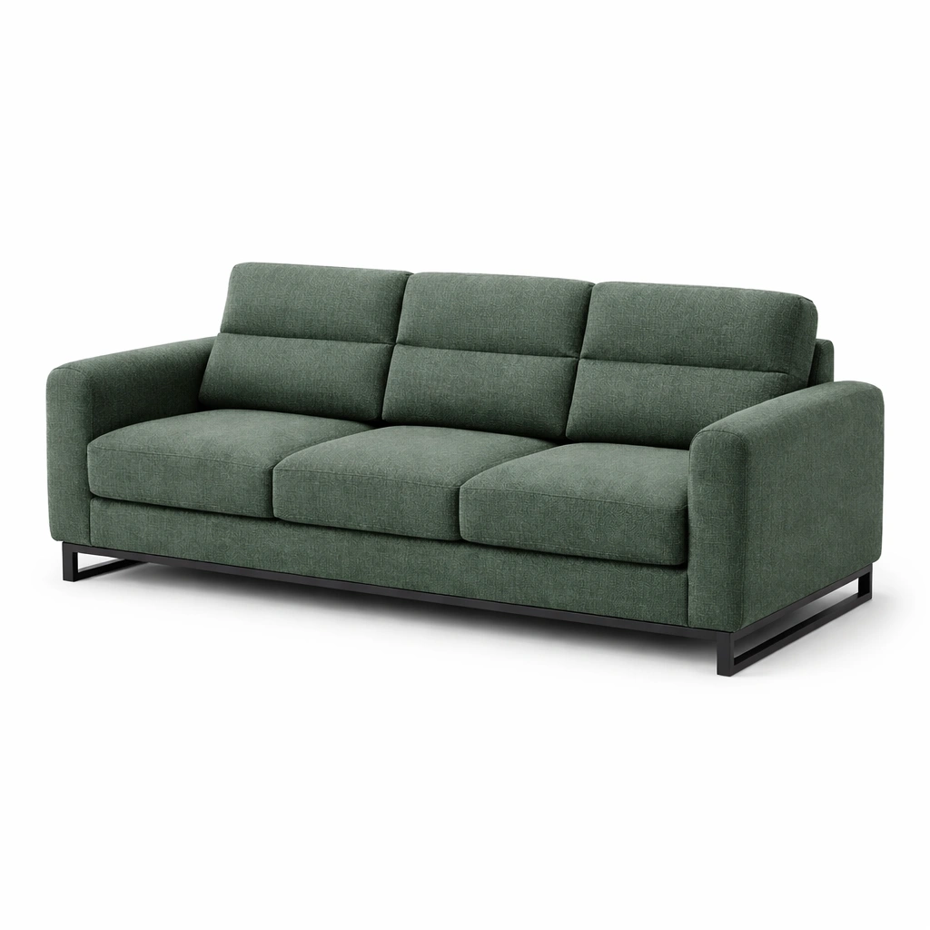 Sofá de tela verde con estructura de metal