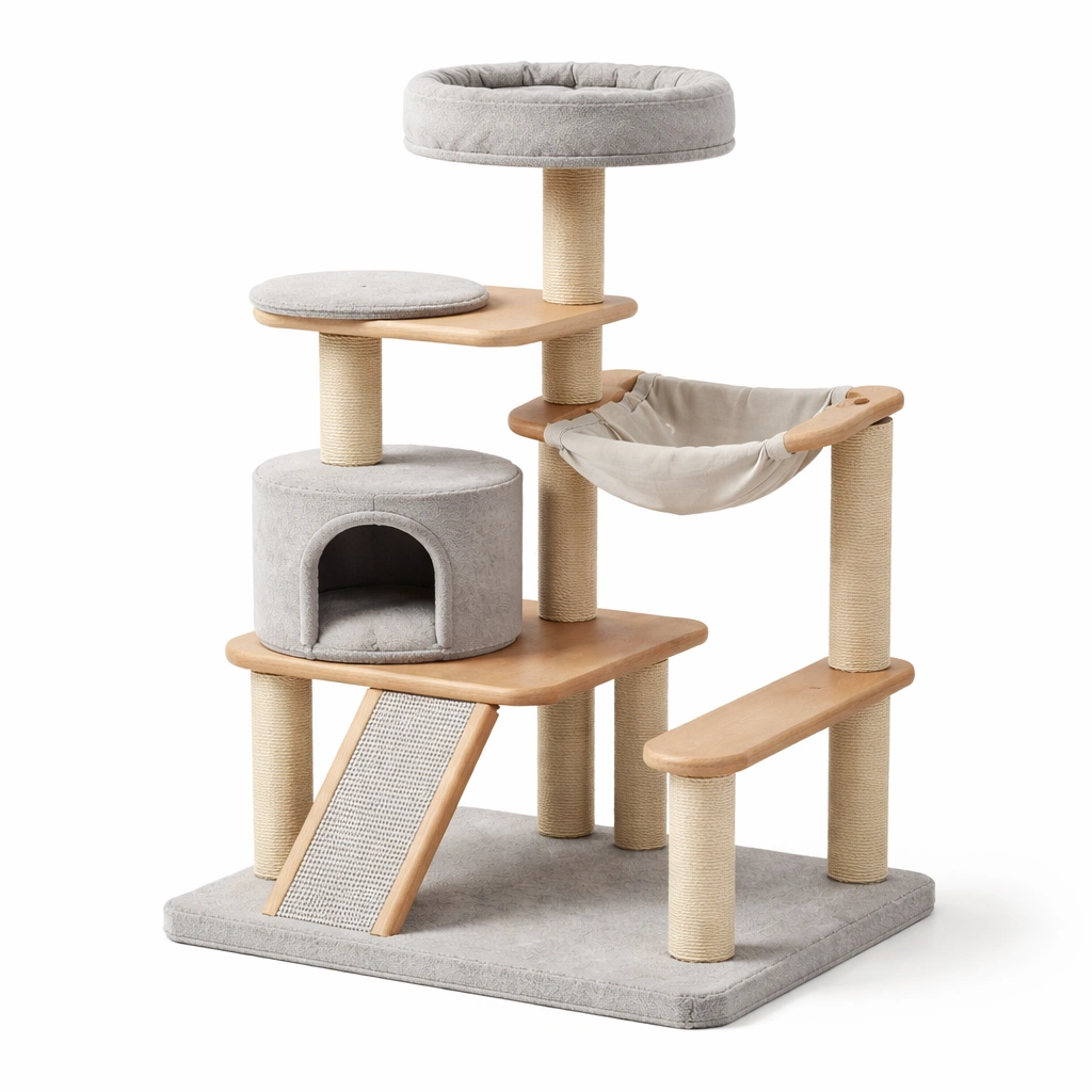 Este árbol para gatos está construido con una estructura de madera y postes recubiertos de sisal, adecuado para el cuidado de las uñas de los gatos. La plataforma y la superficie de descanso están cubiertas de tejido de poliéster, proporcionando un lugar para que los gatos se relajen. El interior está rellenado de espuma de poliuretano.