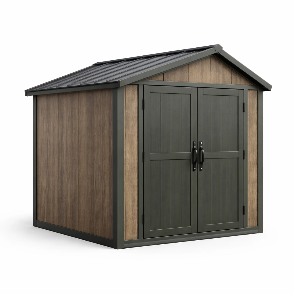 Cobertizo de jardín de resina y acero con techo a dos aguas