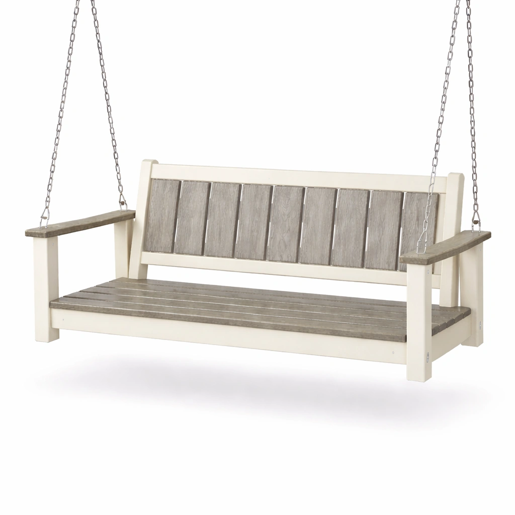 Material: Asiento y respaldo de madera compuesta, estructura de polietileno de alta densidad, cadenas de acero galvanizado.