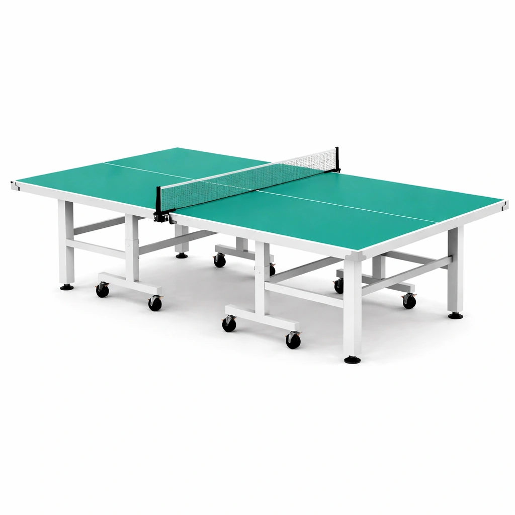 Esta mesa de tenis de mesa cuenta con una estructura de metal y una superficie de MDF. Sus dimensiones son 274 cm x 152 cm x 76 cm. Incluye una red de tenis de mesa y tiene ruedas para facilitar su movilidad.