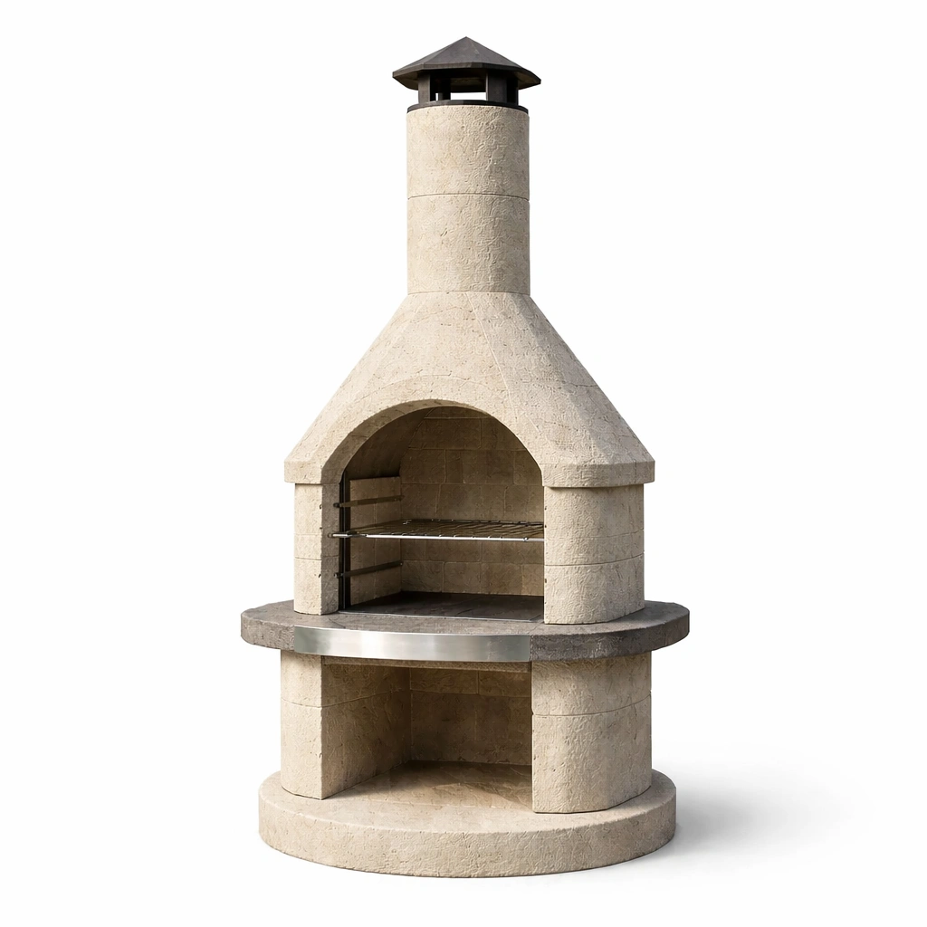 Esta barbacoa de jardín está fabricada en piedra caliza natural con una parrilla de acero inoxidable. Incorpora una chimenea alta para la evacuación eficiente del humo.